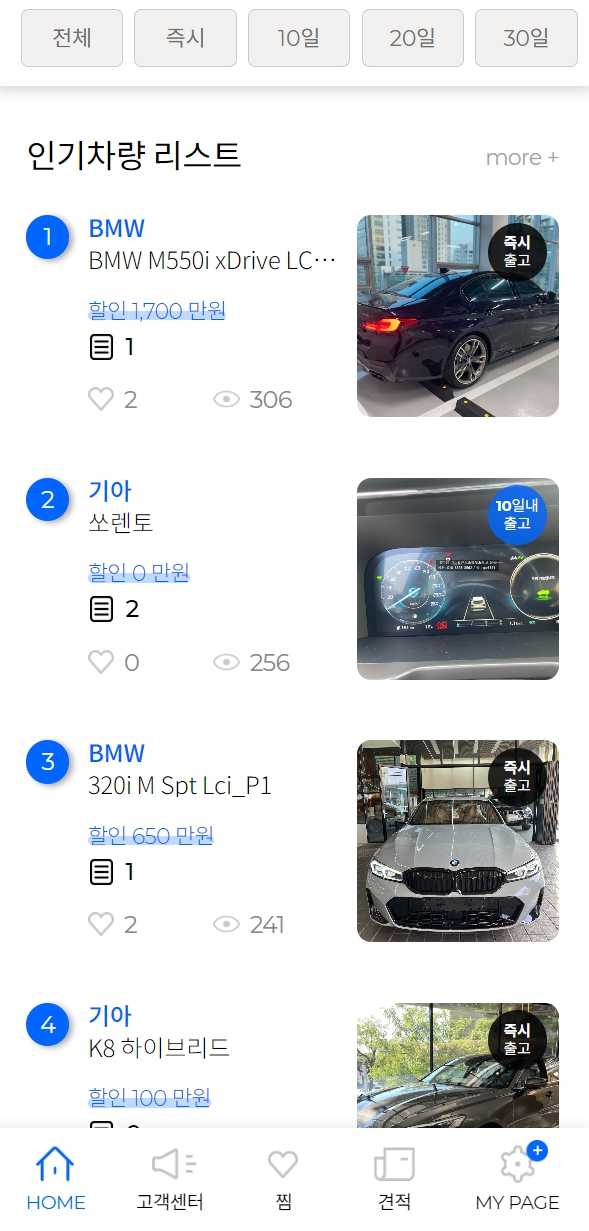 ▶ 원하는 카테고리 별로 구매가능차량부터 할인 금액 까지 바로 확인 가능.